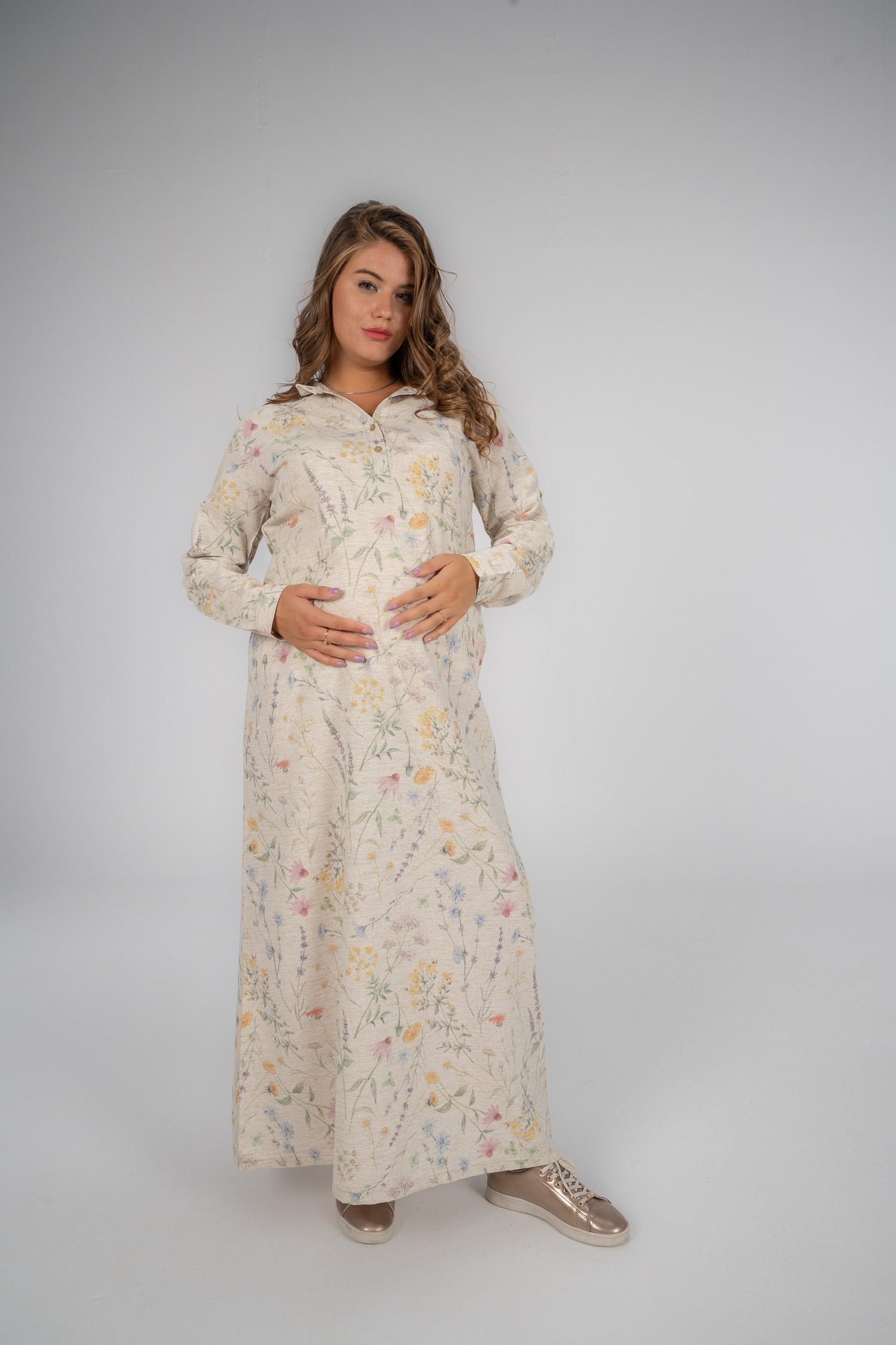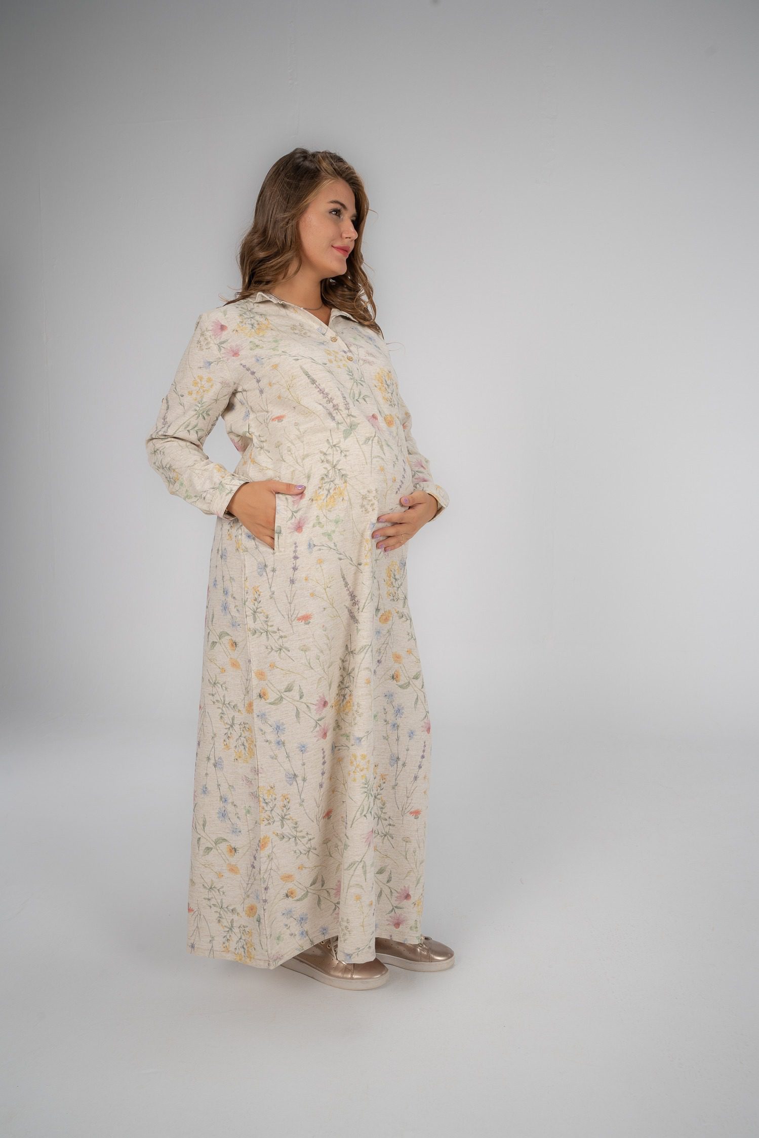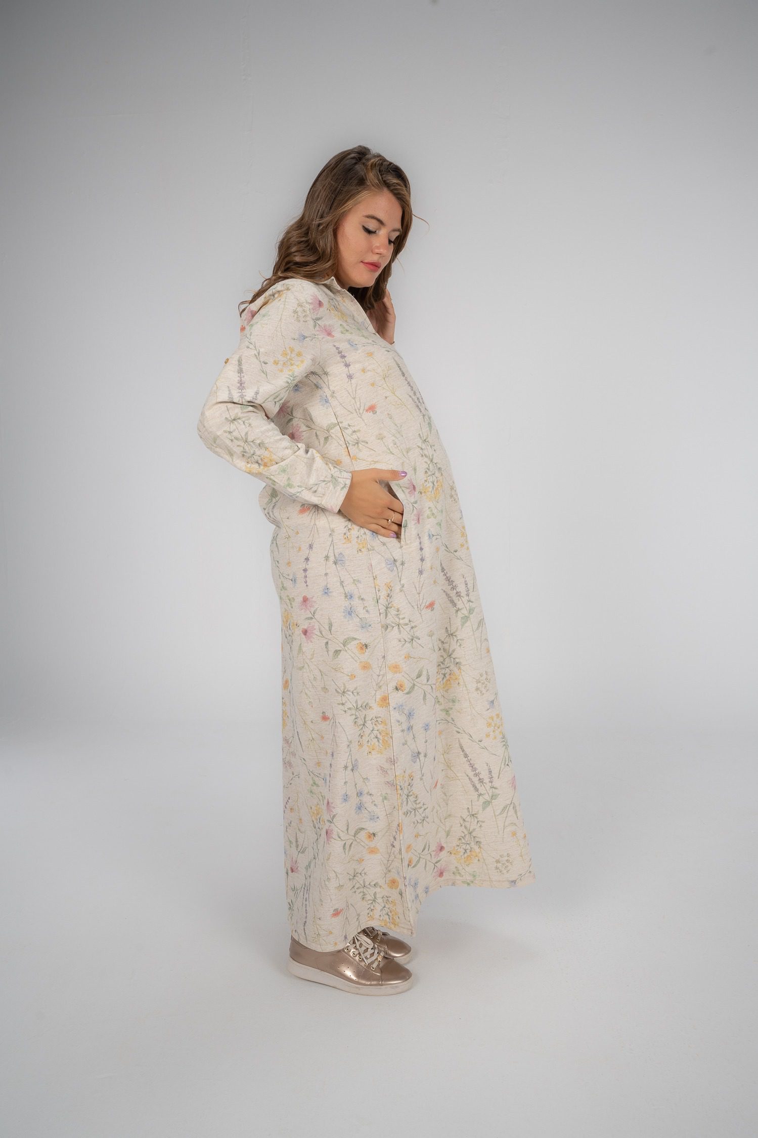 فستان ماكسي ورد رقيق جدا و مريح لمواسم الصيف و الخريف. يتميز بالنعومة والاناقة طوال فترات الحمل و الرضاعة و ما بعدهم.