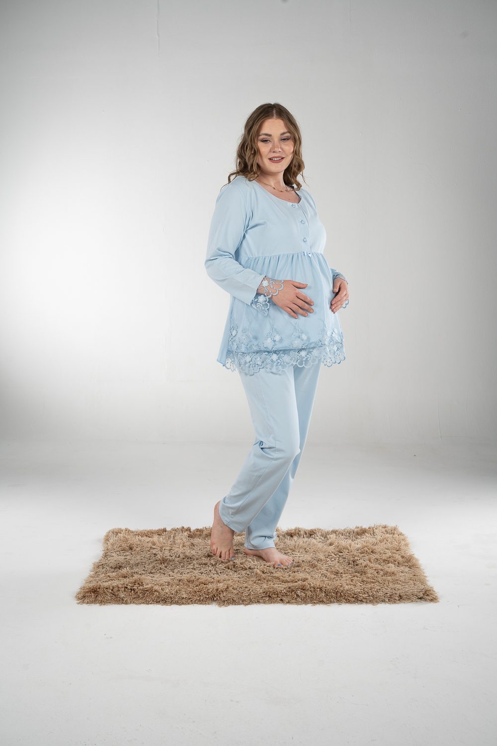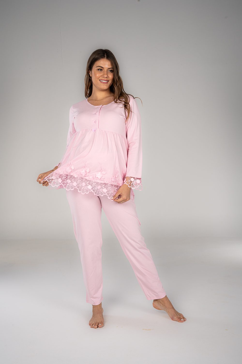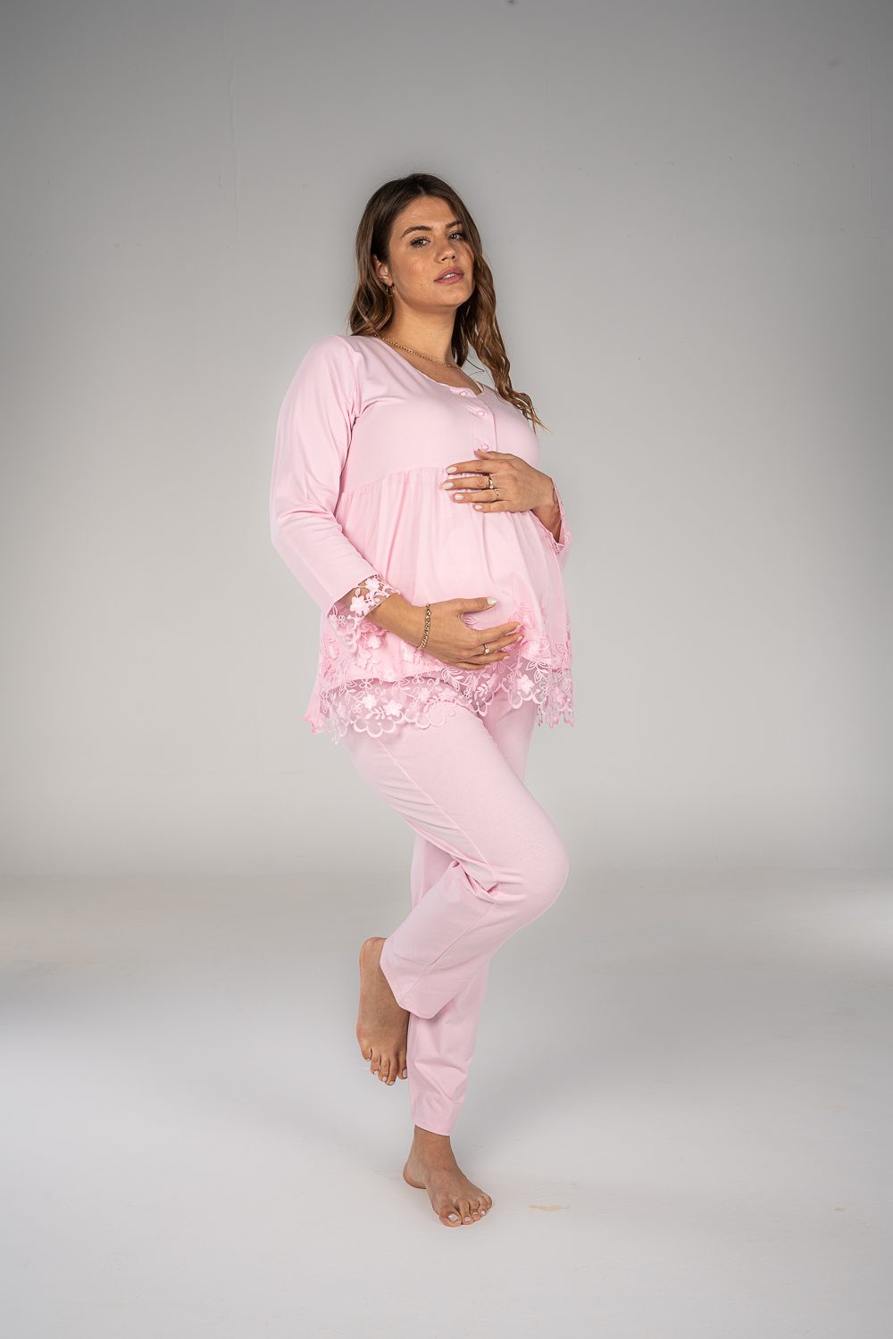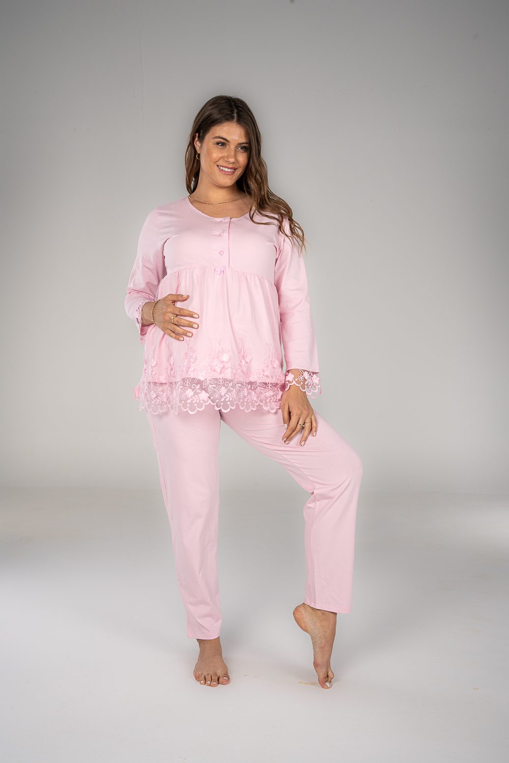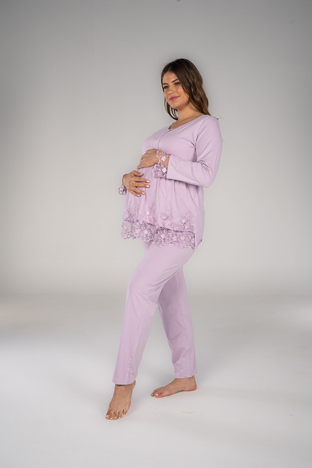 Stay comfy and stylish with our breathable maternity and nursing long sleeve pajama set. The material is cotton with pretty details on the sleeves. The chest clips make nursing quick and easy. The pants have an adjustable elastic waist that keeps you comfortable during every stage of motherhood