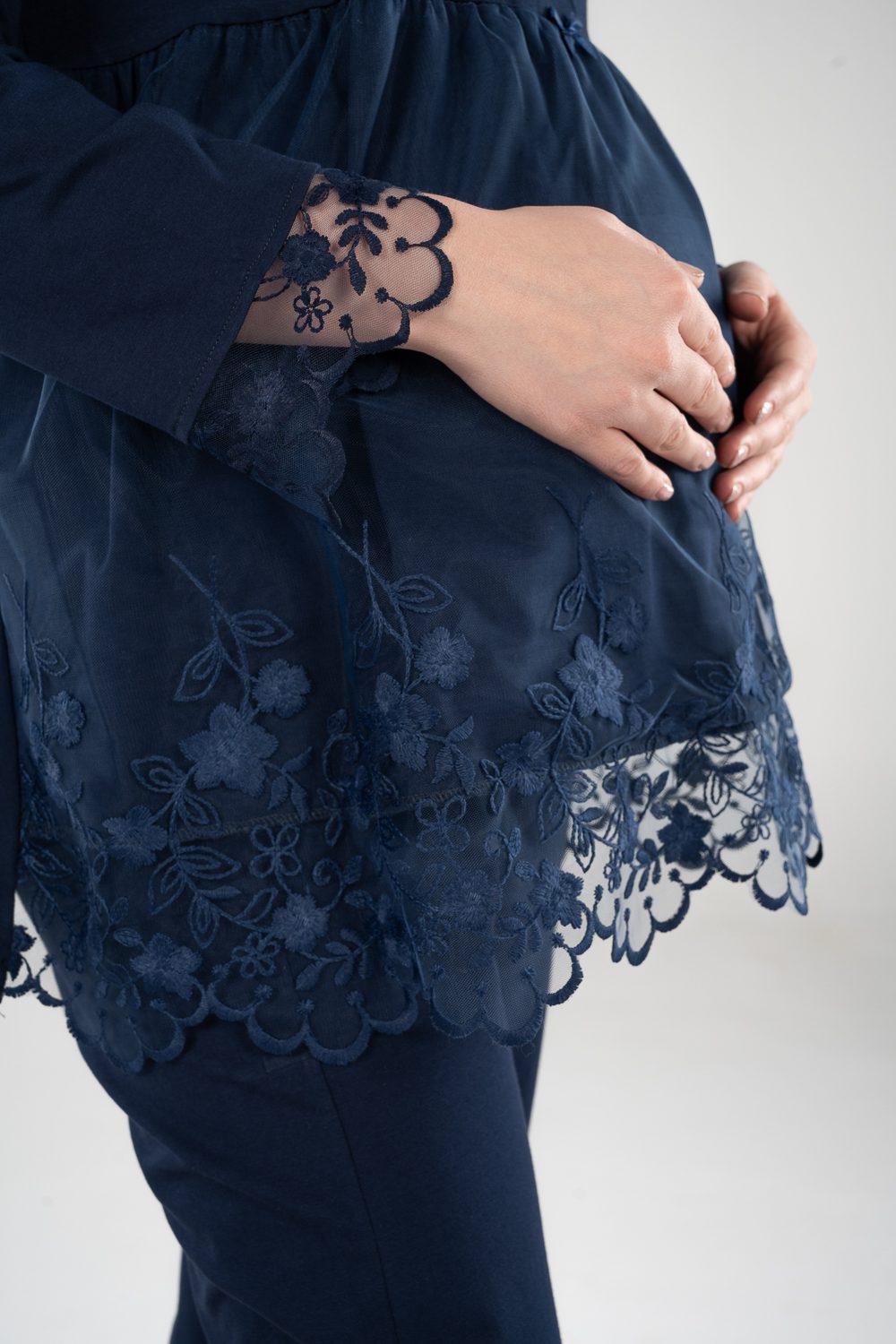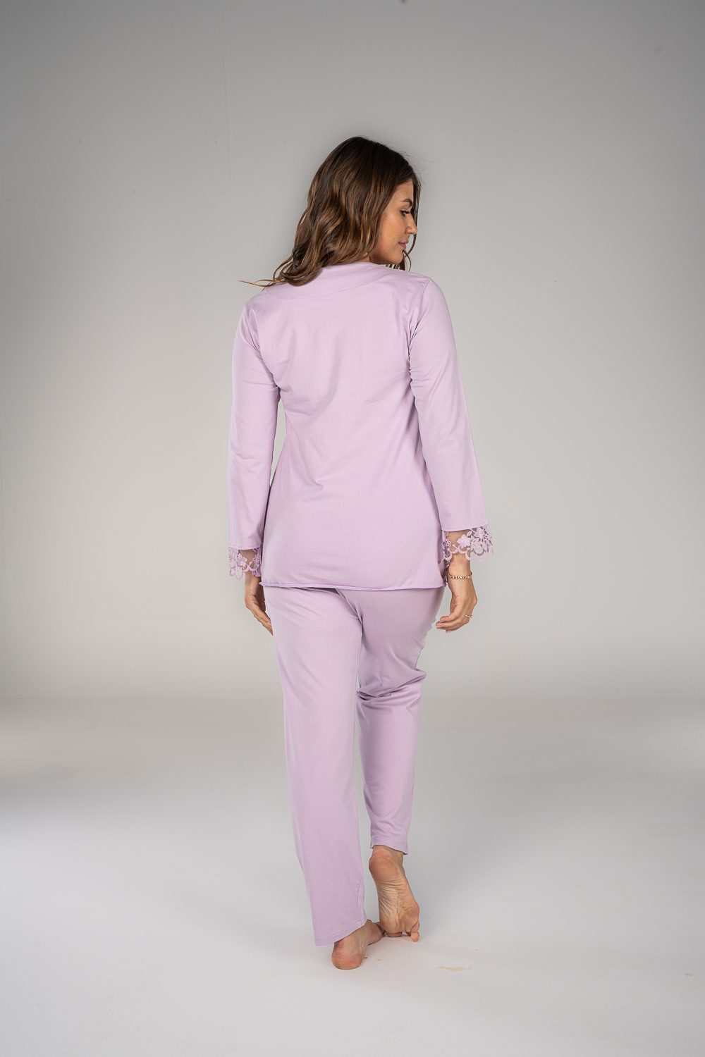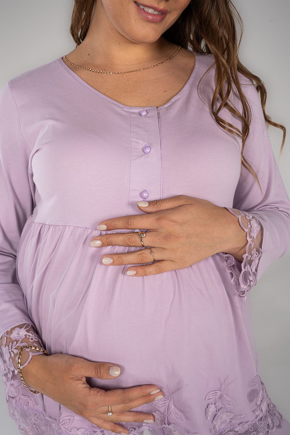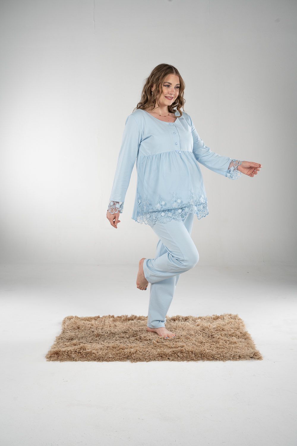 Stay comfy and stylish with our breathable maternity and nursing long sleeve pajama set. The material is cotton with pretty details on the sleeves. The chest clips make nursing quick and easy. The pants have an adjustable elastic waist that keeps you comfortable during every stage of motherhood