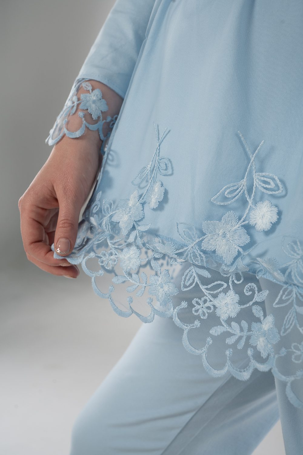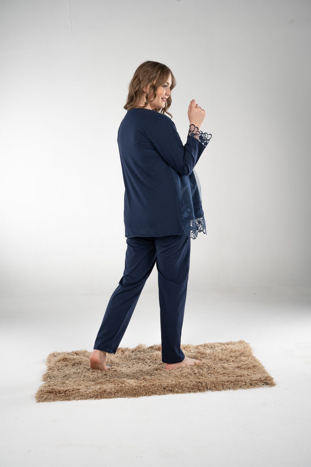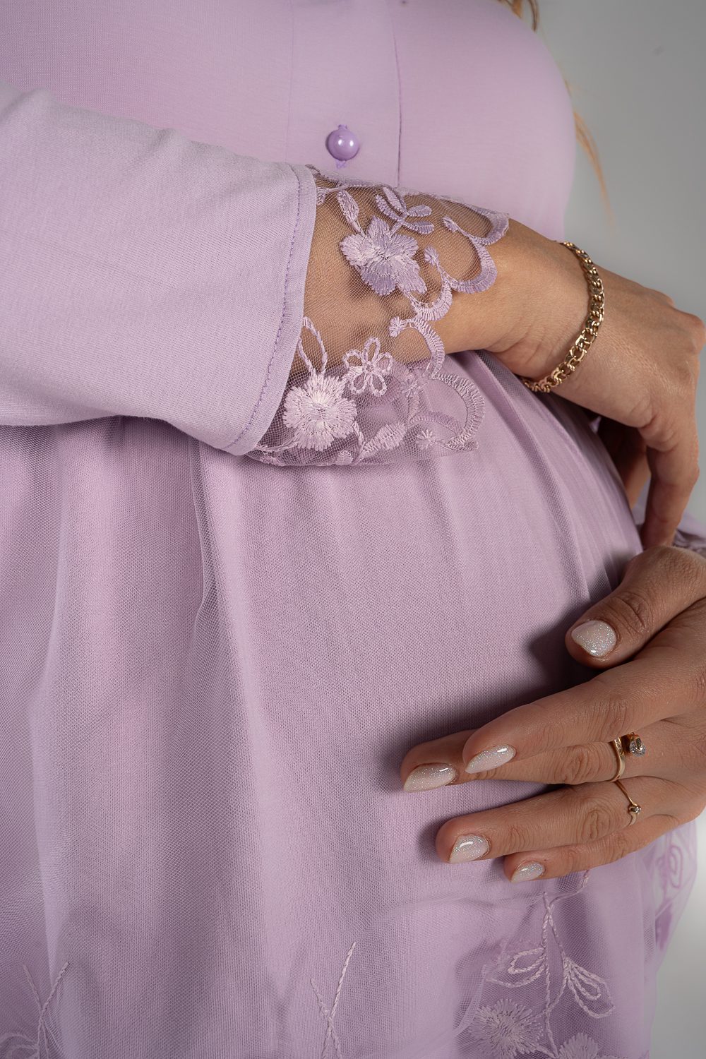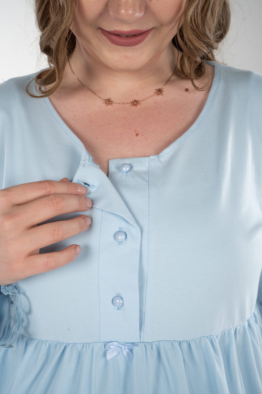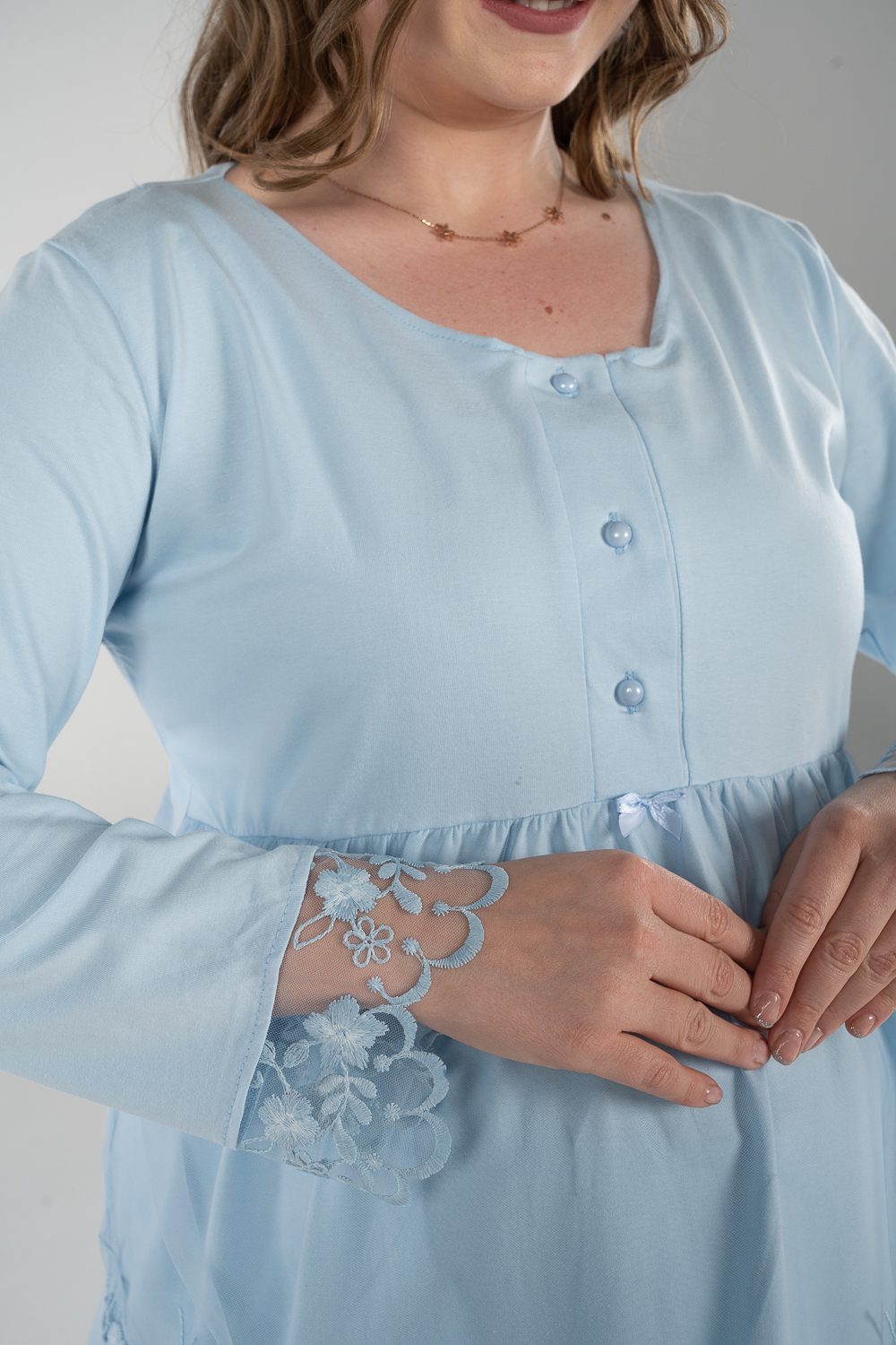 Stay comfy and stylish with our breathable maternity and nursing long sleeve pajama set. The material is cotton with pretty details on the sleeves. The chest clips make nursing quick and easy. The pants have an adjustable elastic waist that keeps you comfortable during every stage of motherhood