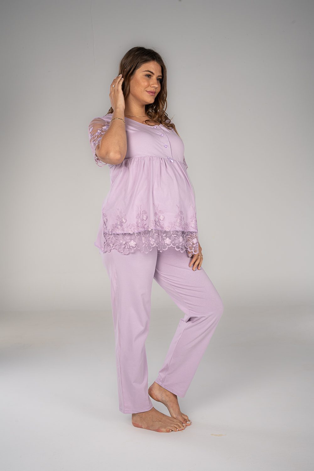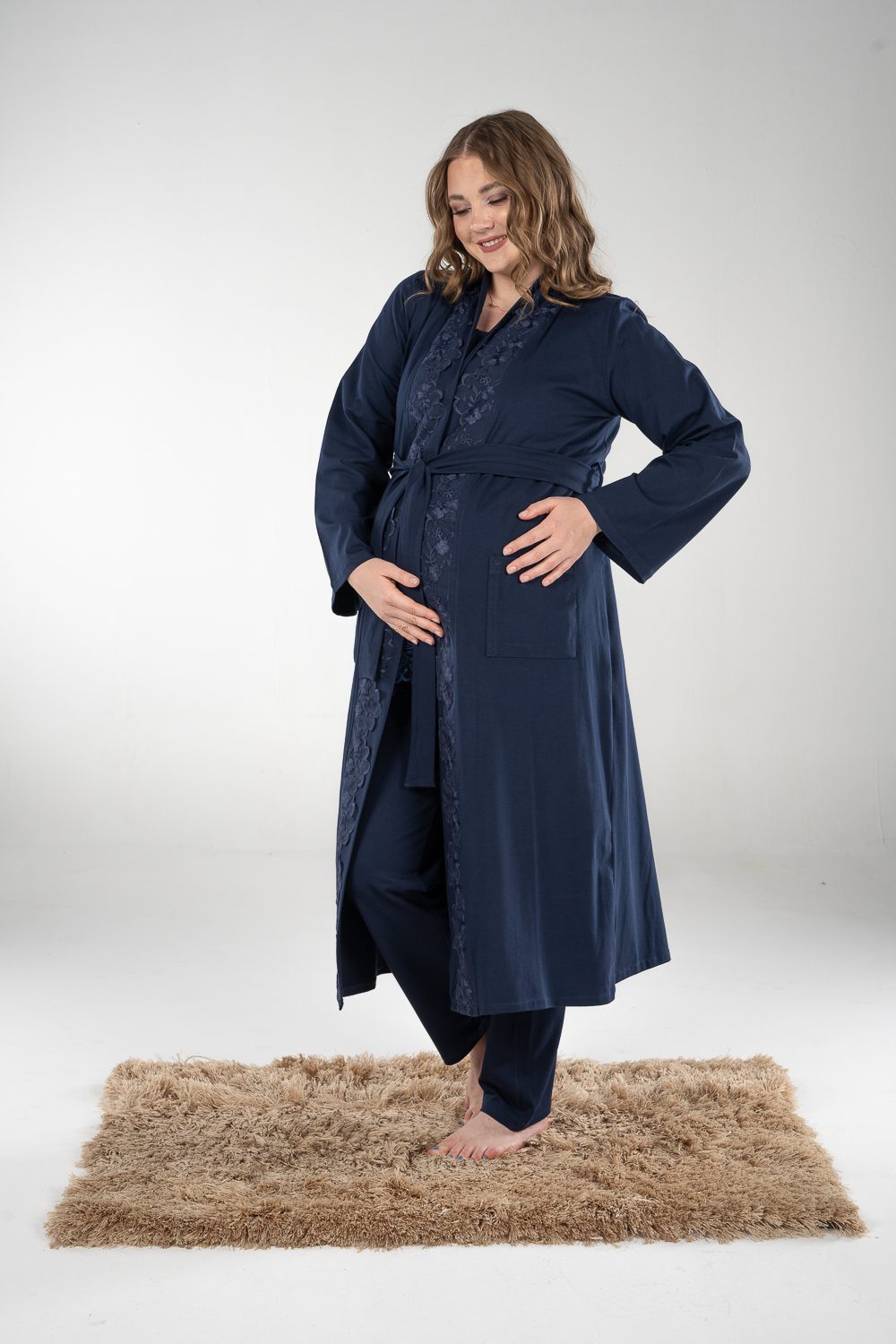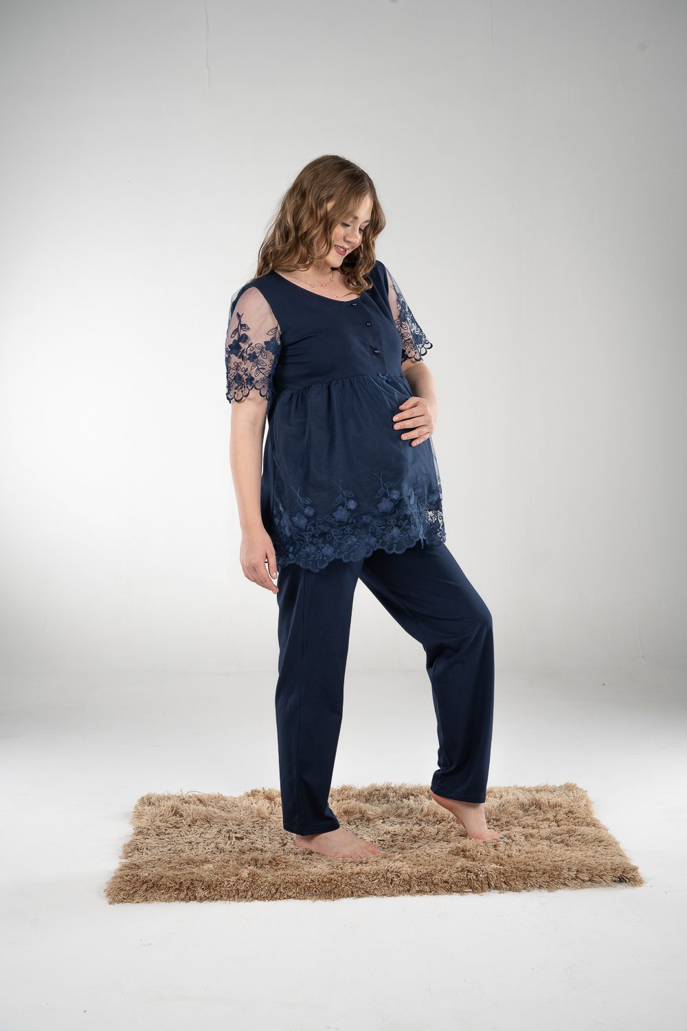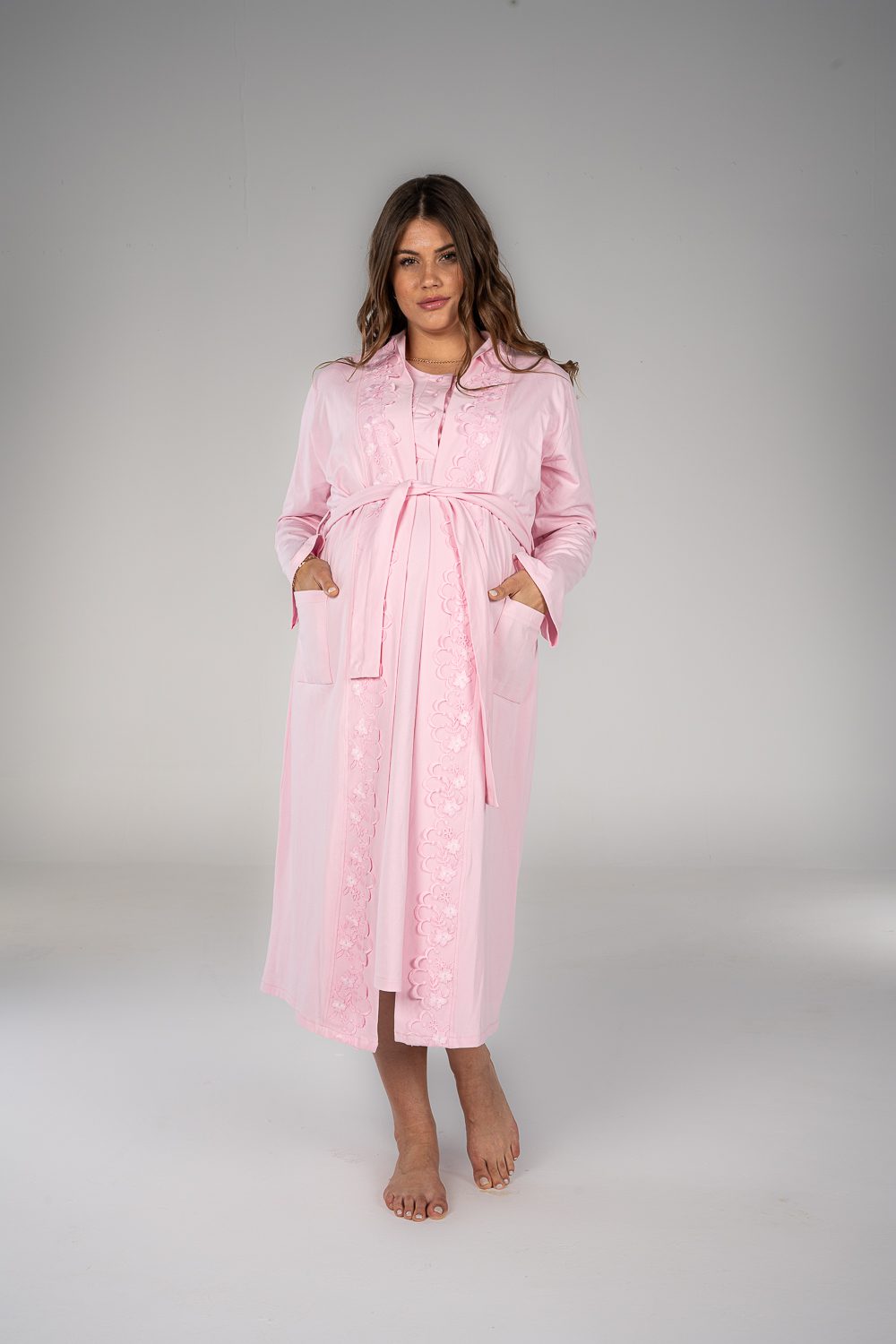 Momtobe’s pajama set for maternity and nursing is your go to set this summer. Set includes: a breathable midi robe, and a comfortable half-sleeve PJ with adjustable waist and beautiful tulle details. Crafted from premium materials, this set offers both comfort and style throughout your pregnancy.