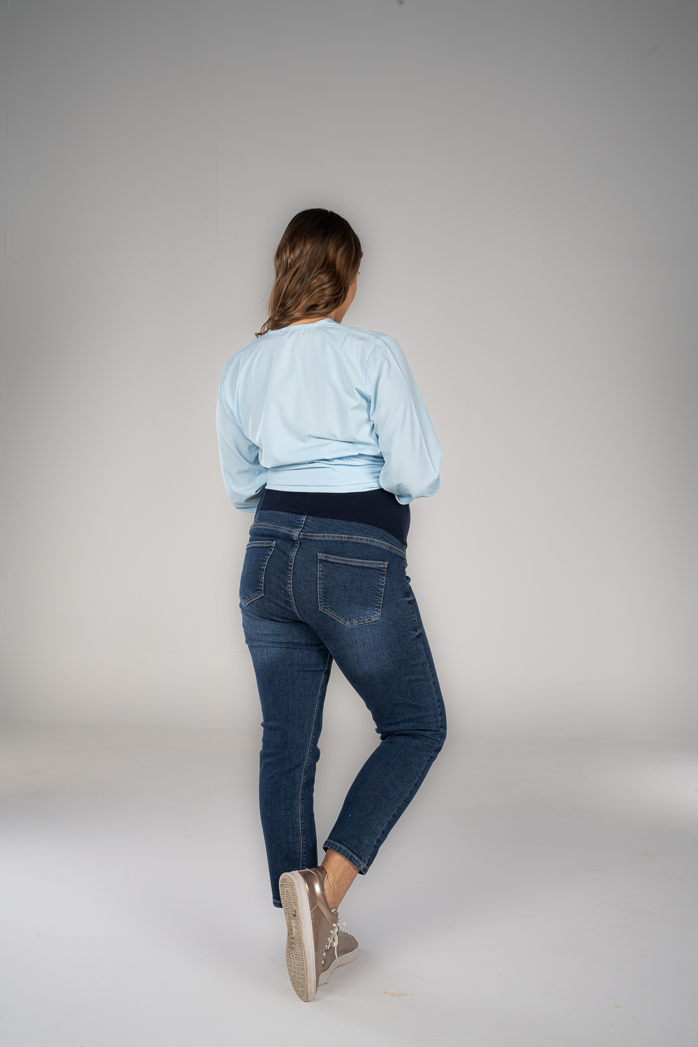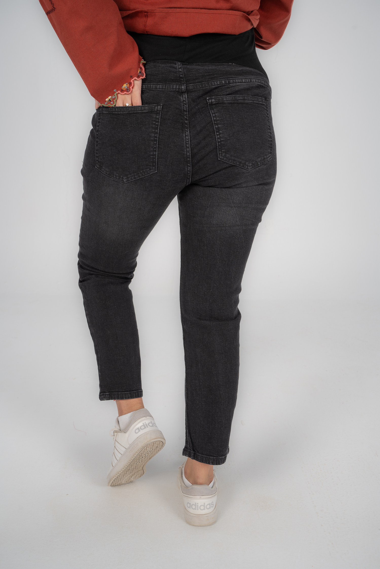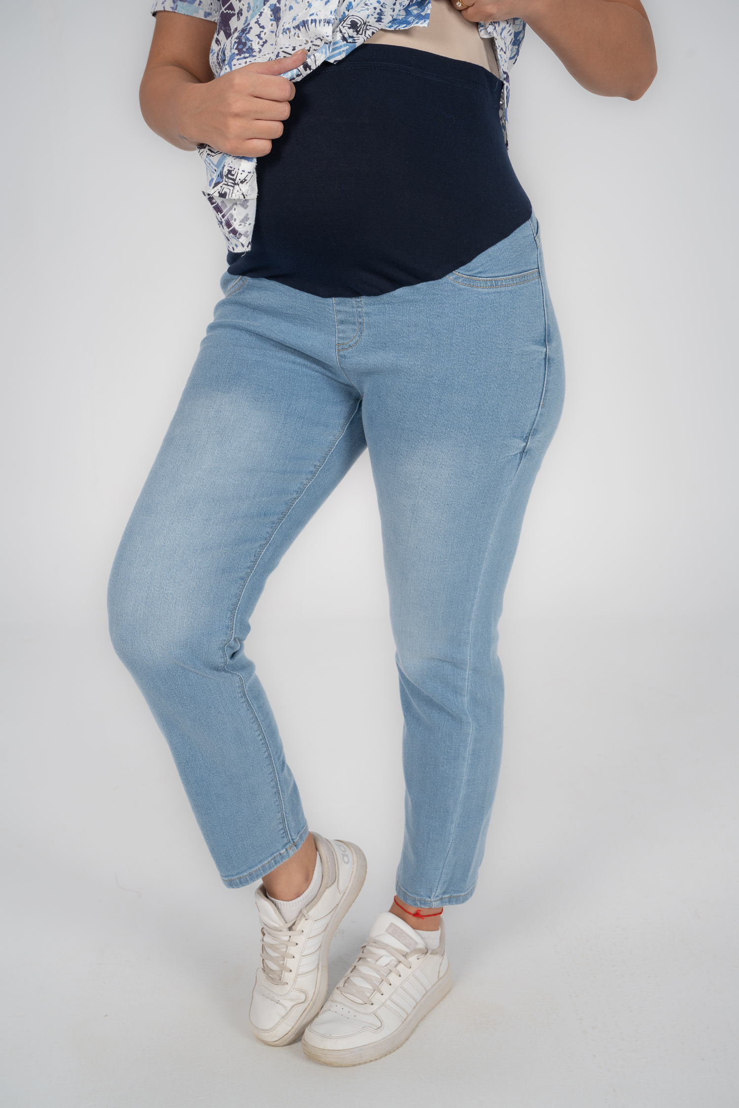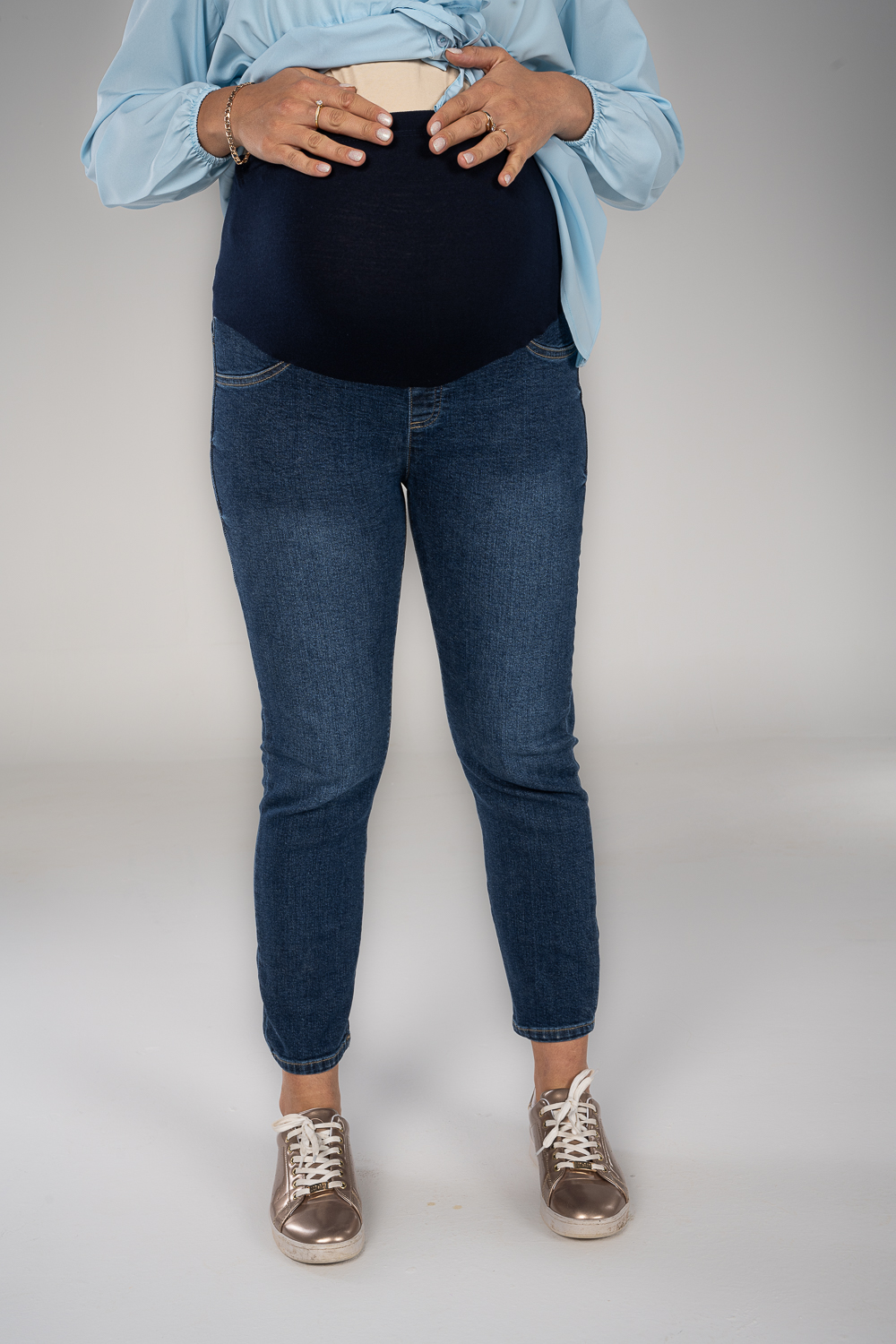 Denim jeans with fake pockets and adjustable waist to grow with your tummy. Available in 2 colors.