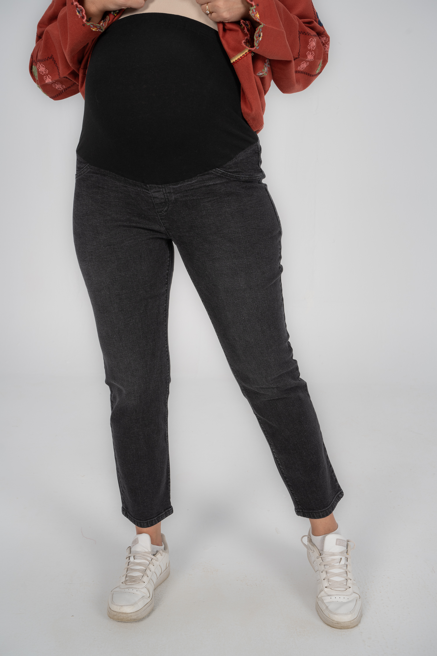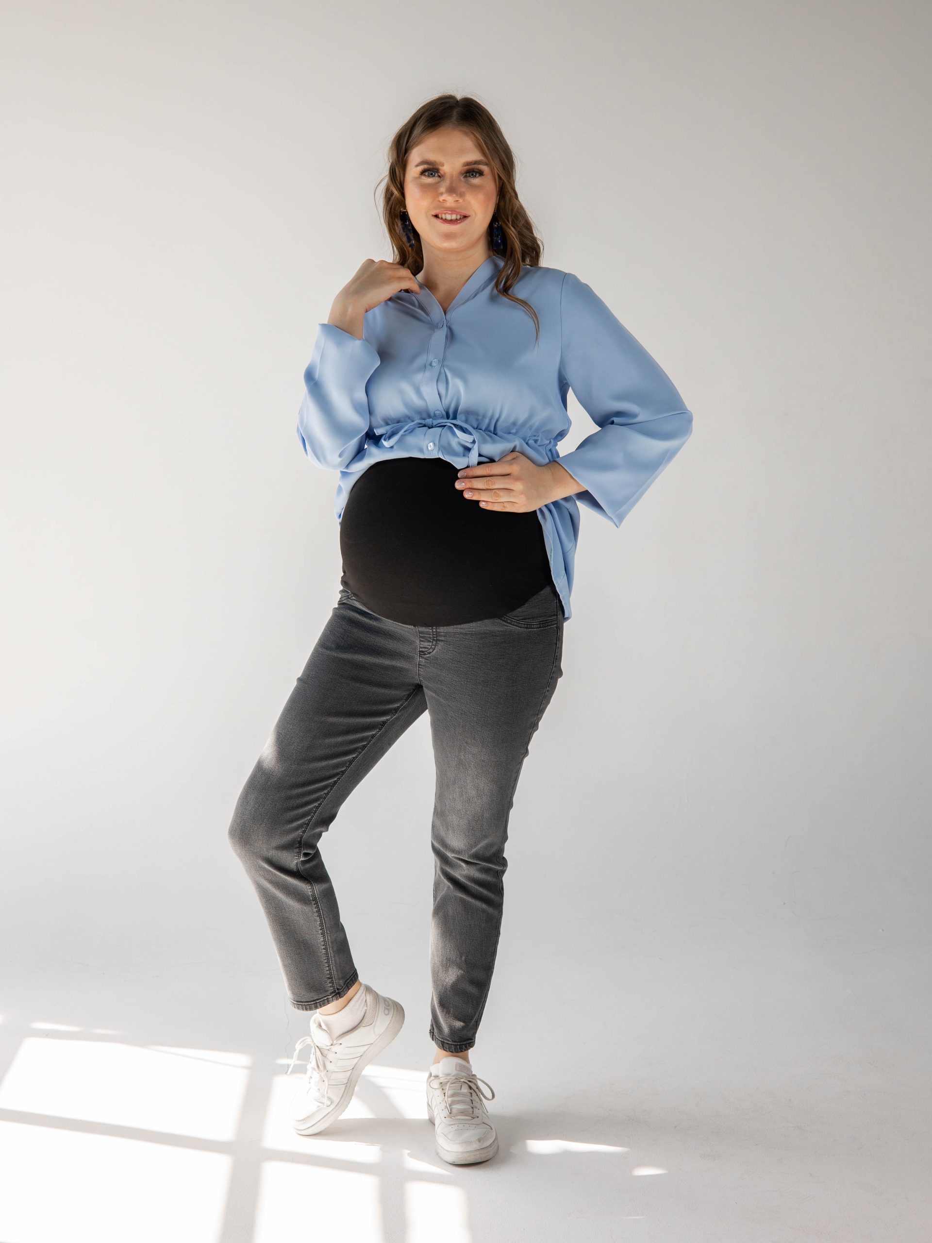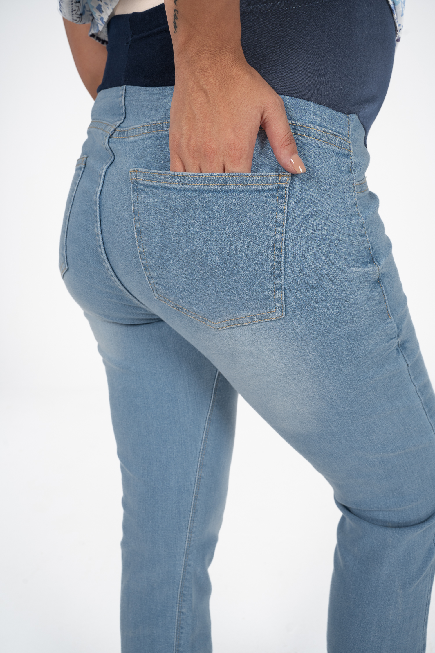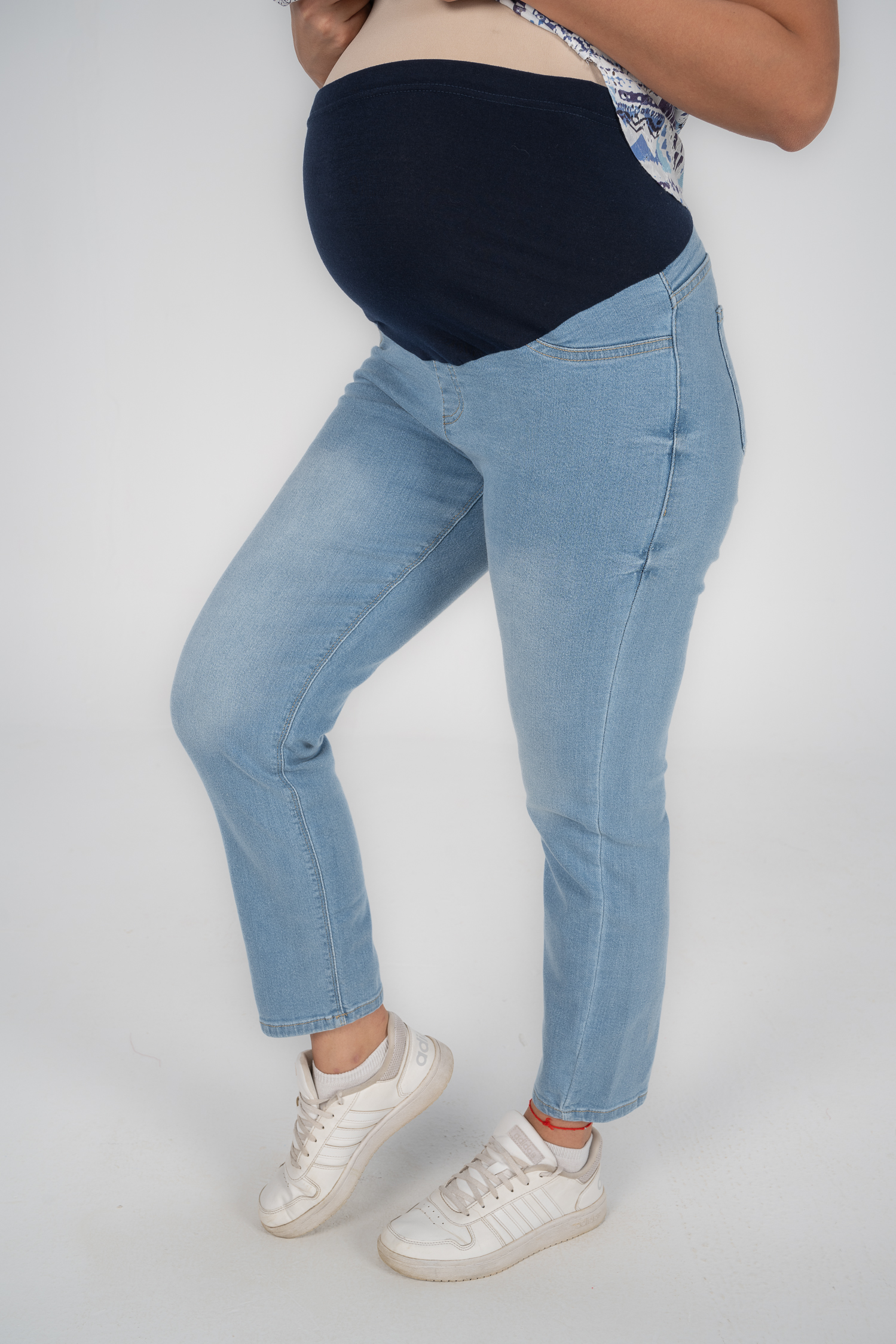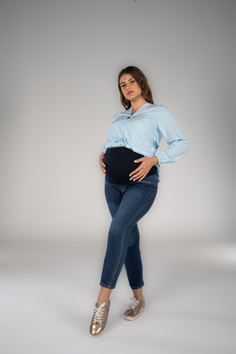 Denim jeans with fake pockets and adjustable waist to grow with your tummy. Available in 2 colors.