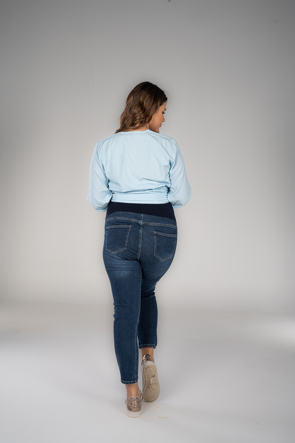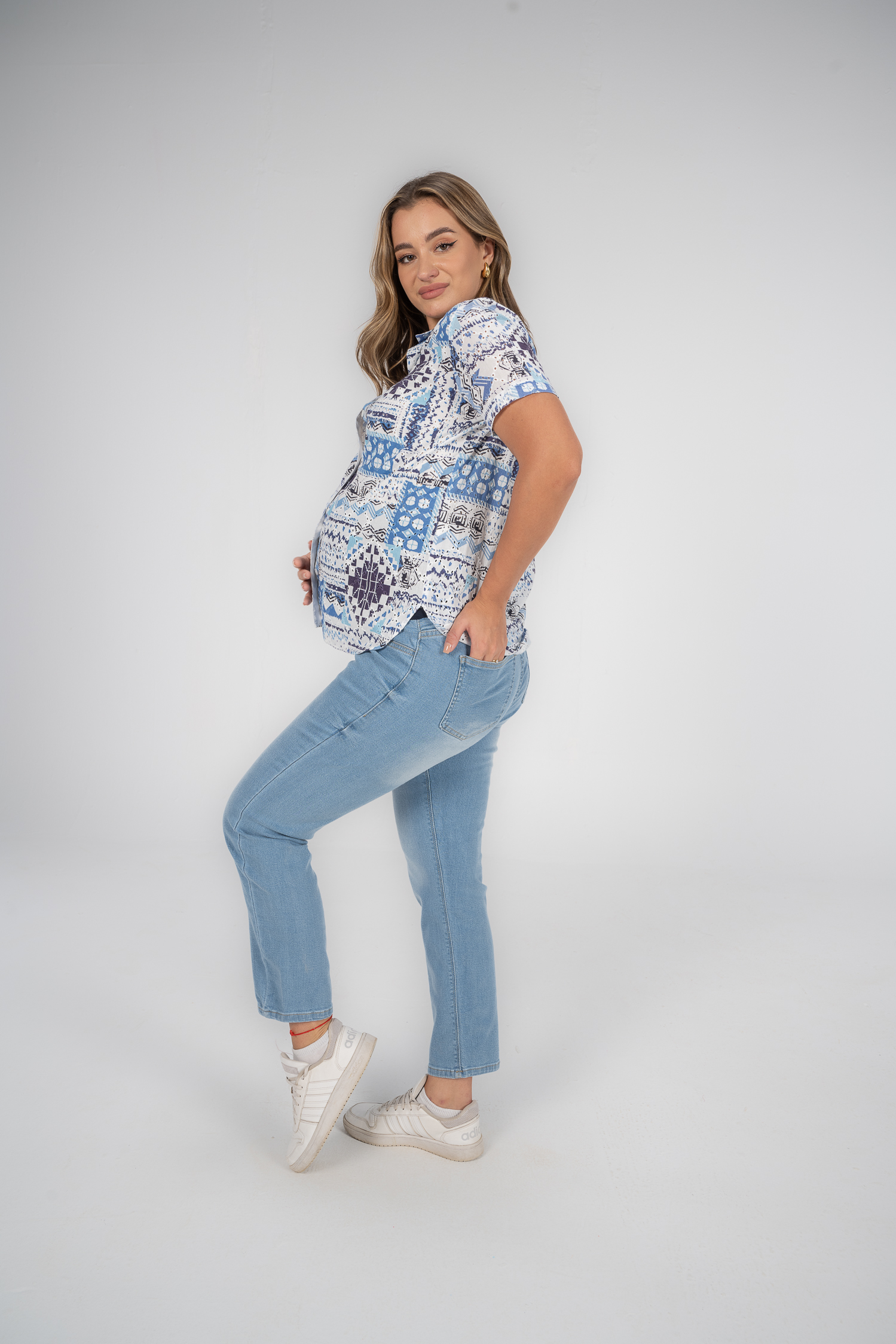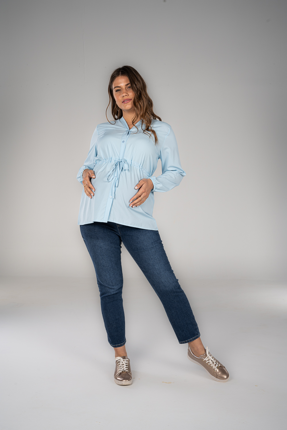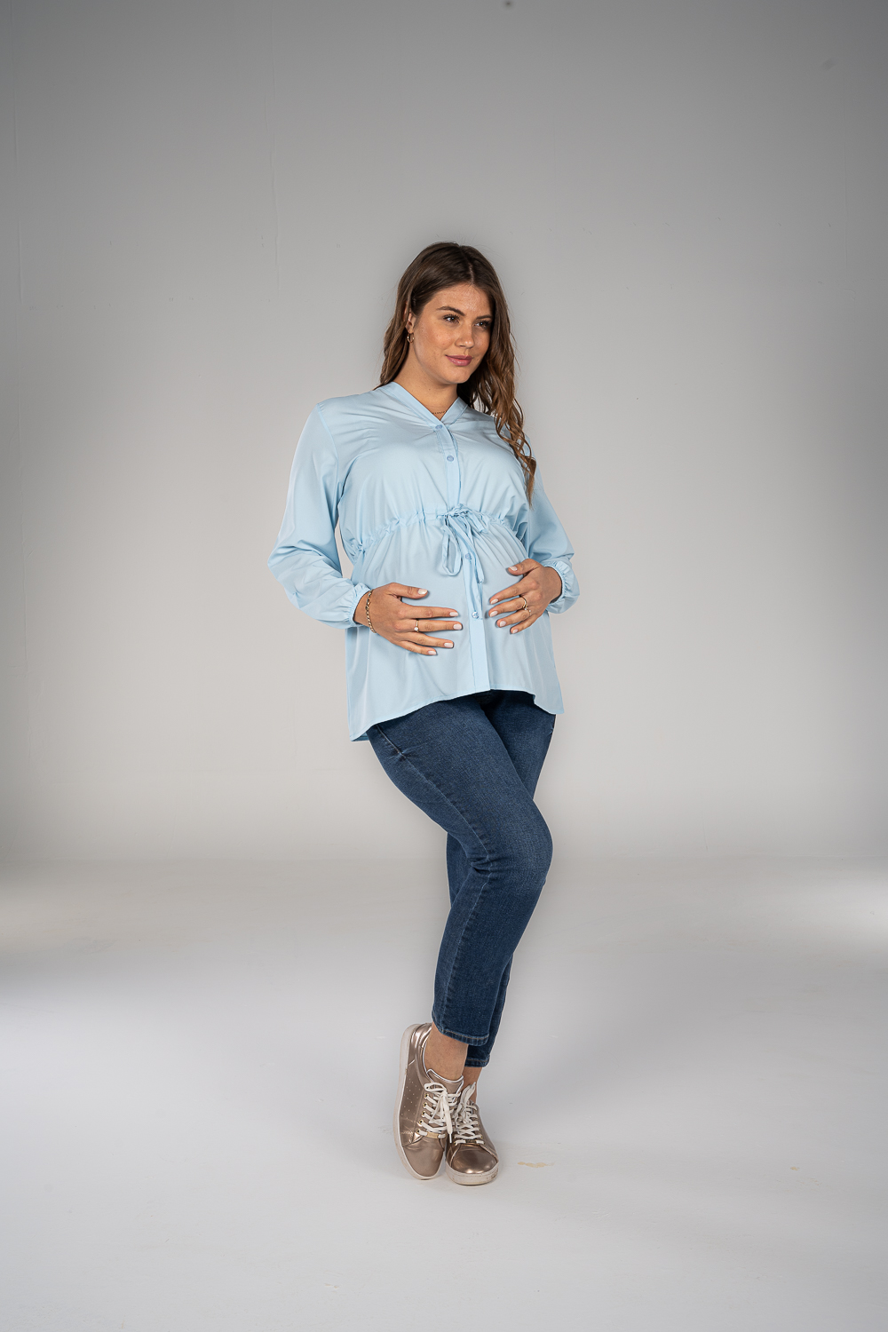 Denim jeans with fake pockets and adjustable waist to grow with your tummy. Available in 2 colors.