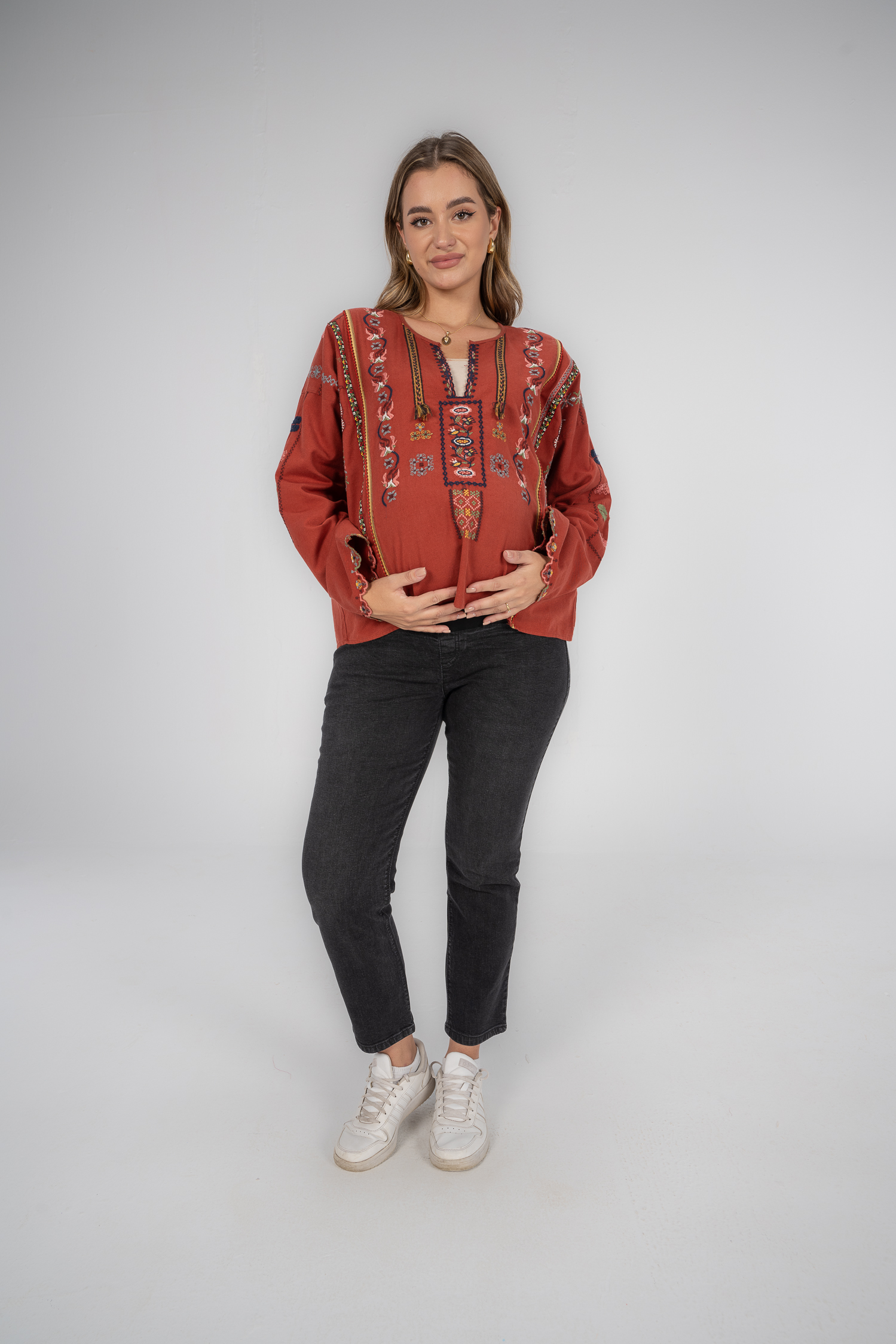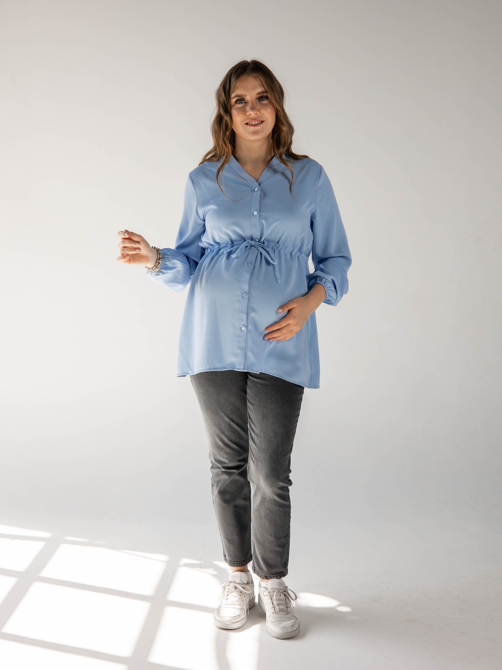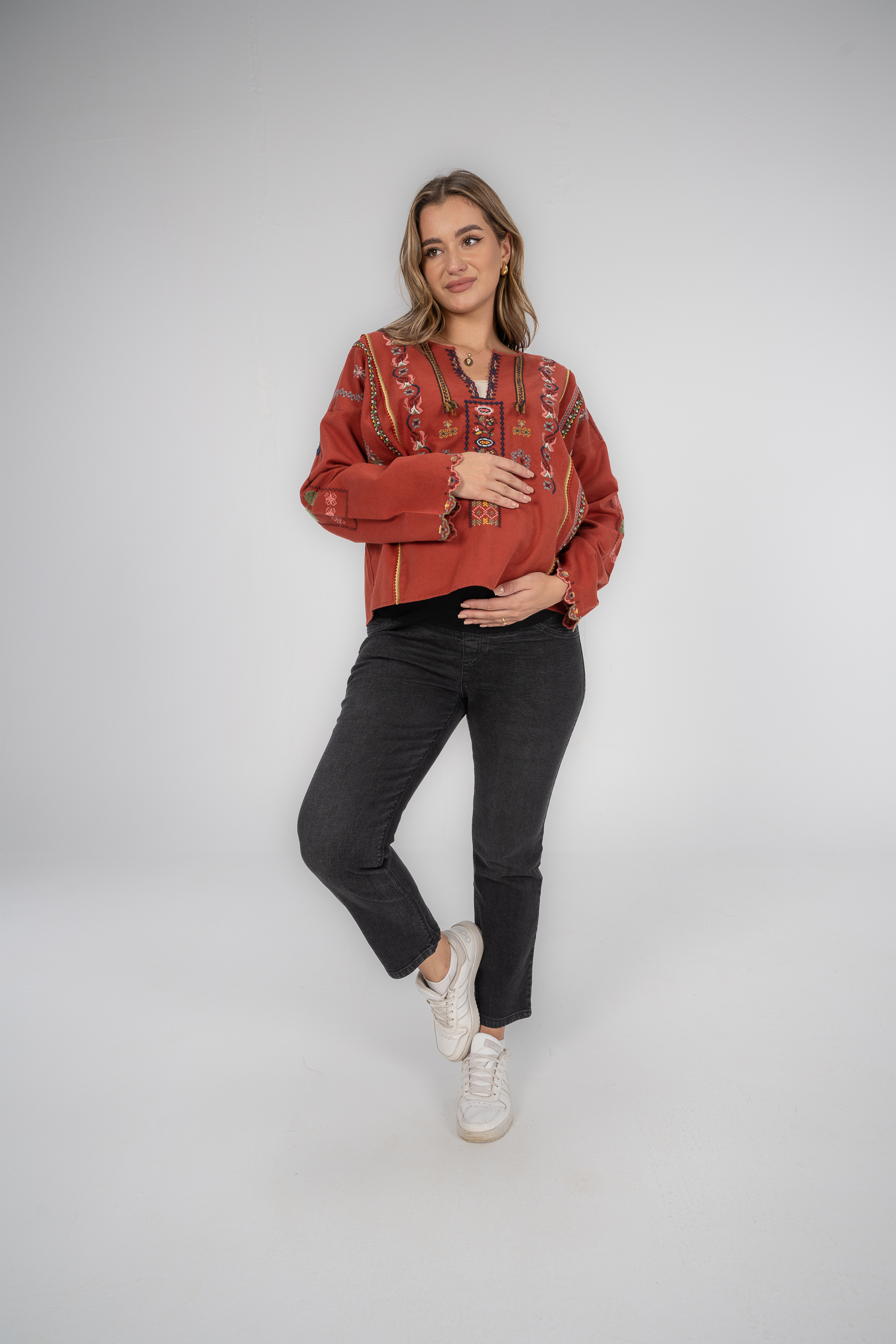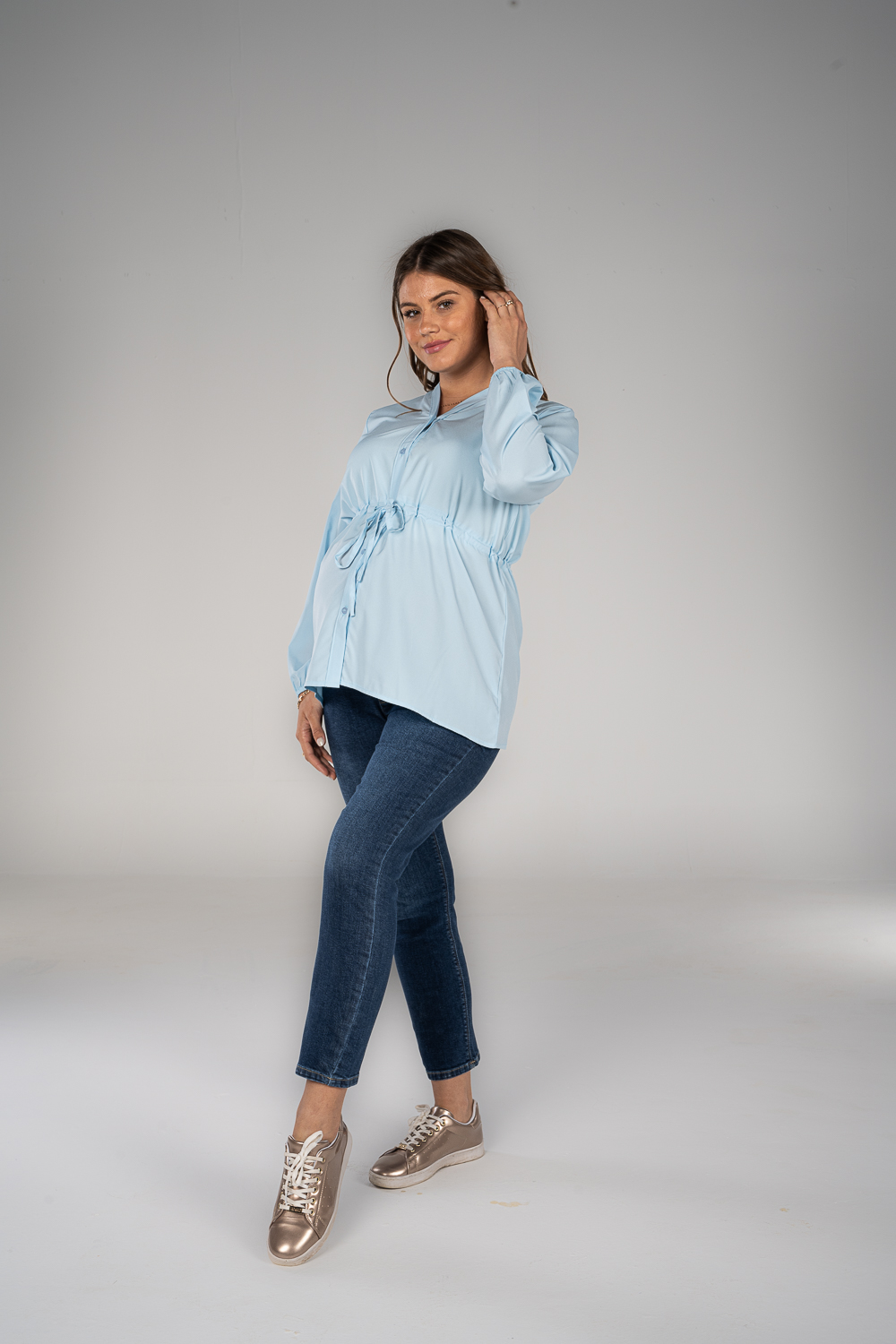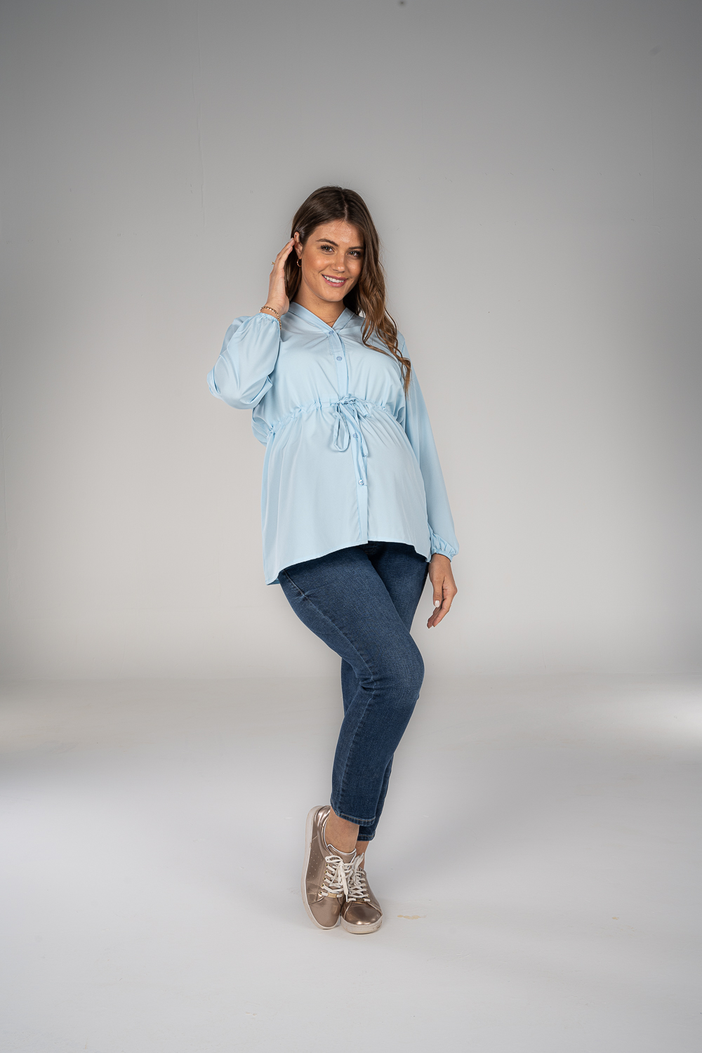 Denim jeans with fake pockets and adjustable waist to grow with your tummy. Available in 2 colors.