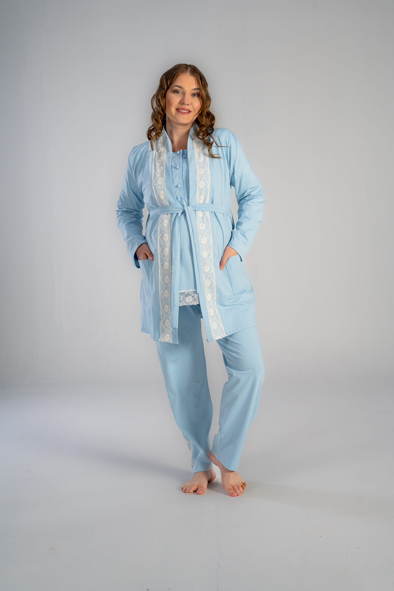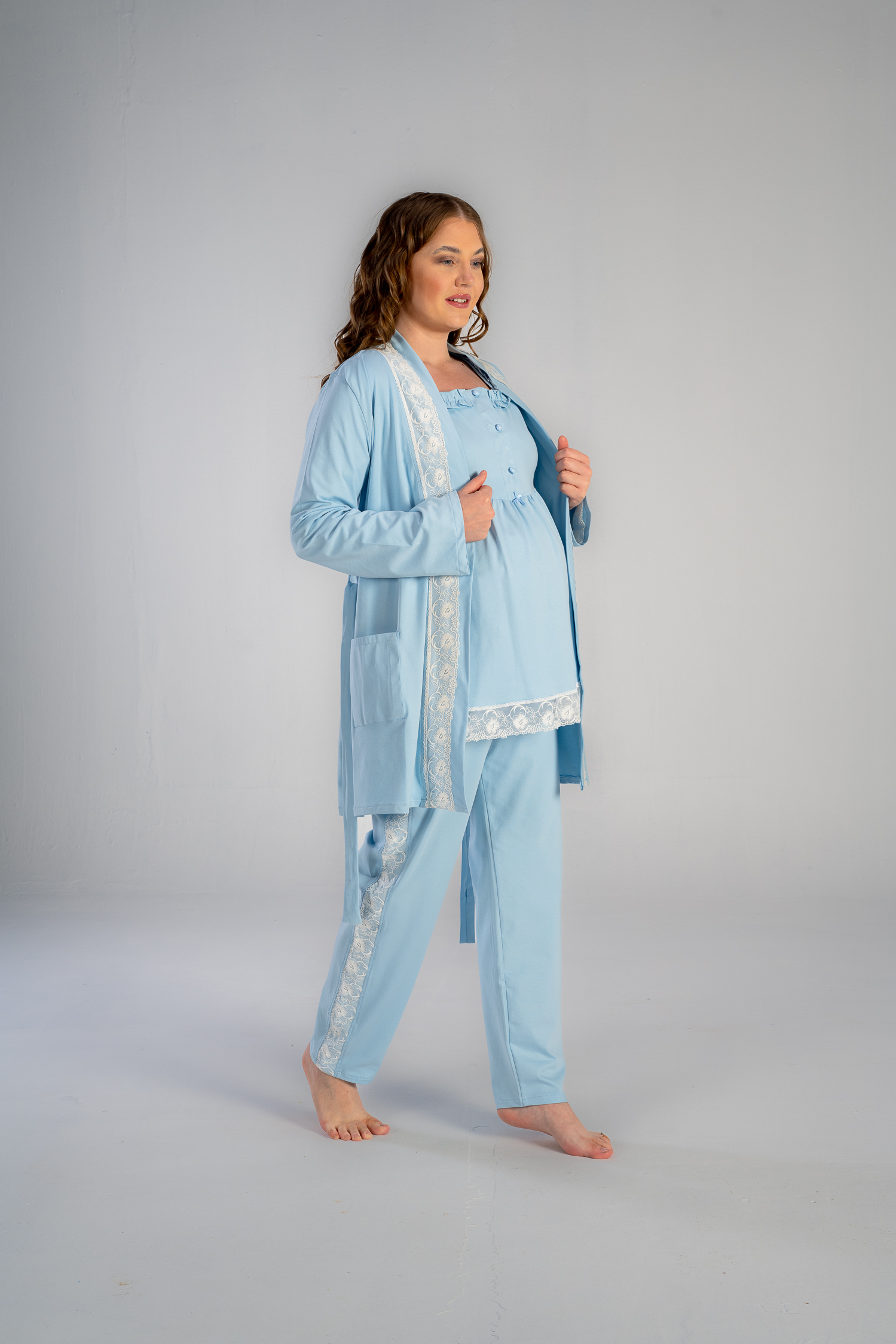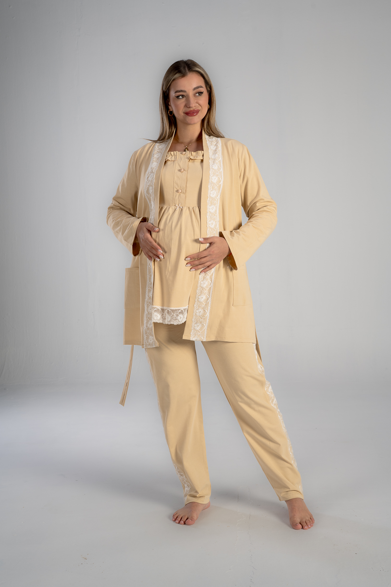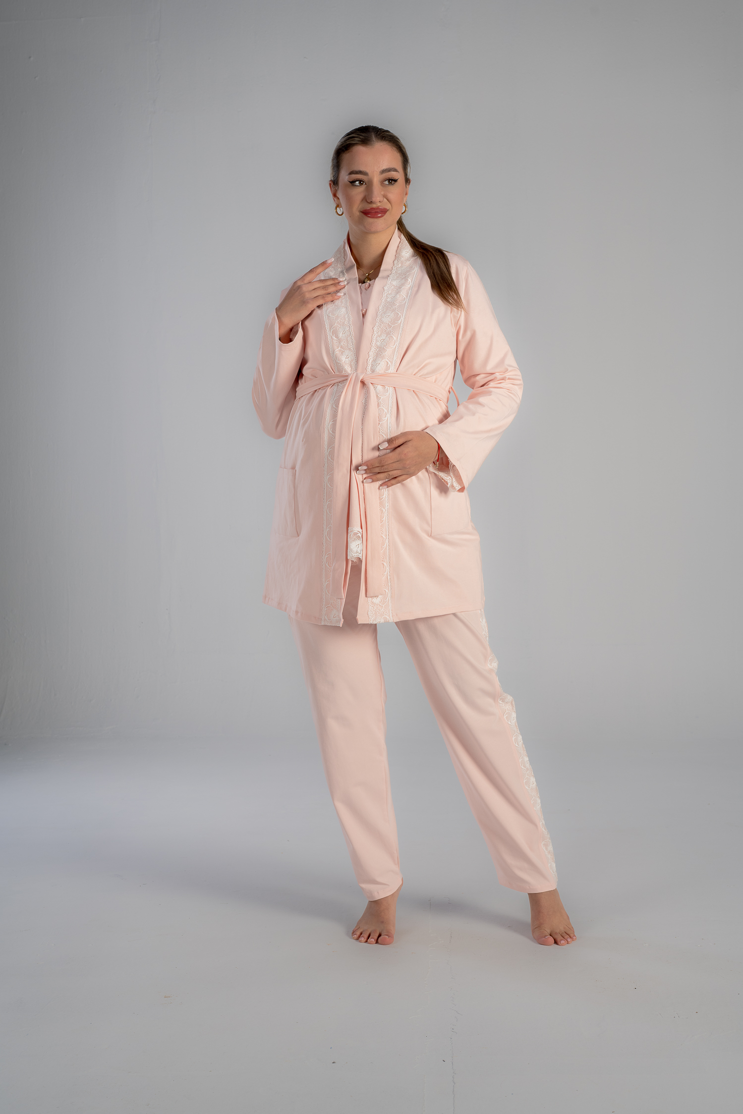 Get the mommy wardrobe essential maternity and nursing set.The set includes: a breathable short robe, and a comfortable long-sleeve PJ with adjustable waist. Crafted from premium materials, this set offers both comfort and style throughout your pregnancy.